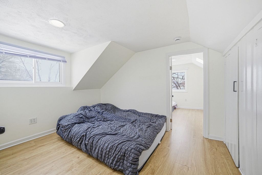 Welcome to this bright, sun-drenched home with lovely views of Flax Pond! The open-concept living and kitchen area features soaring cathedral ceilings and multiple skylights, creating an airy, inviting space filled with natural light. The kitchen is beautifully appointed with stainless steel appliances, white shaker cabinets, and granite countertops.The partially finished basement offers flexible space, perfect for a family room, home office, or workout area. The upper level features two, possibly three, bedrooms, including a pass-through room ideal for a nursery, office, or creative space. The spacious main bedroom is a true retreat, flooded with sunlight throughout the day. A wonderful opportunity to enjoy comfortable living with scenic pond views!