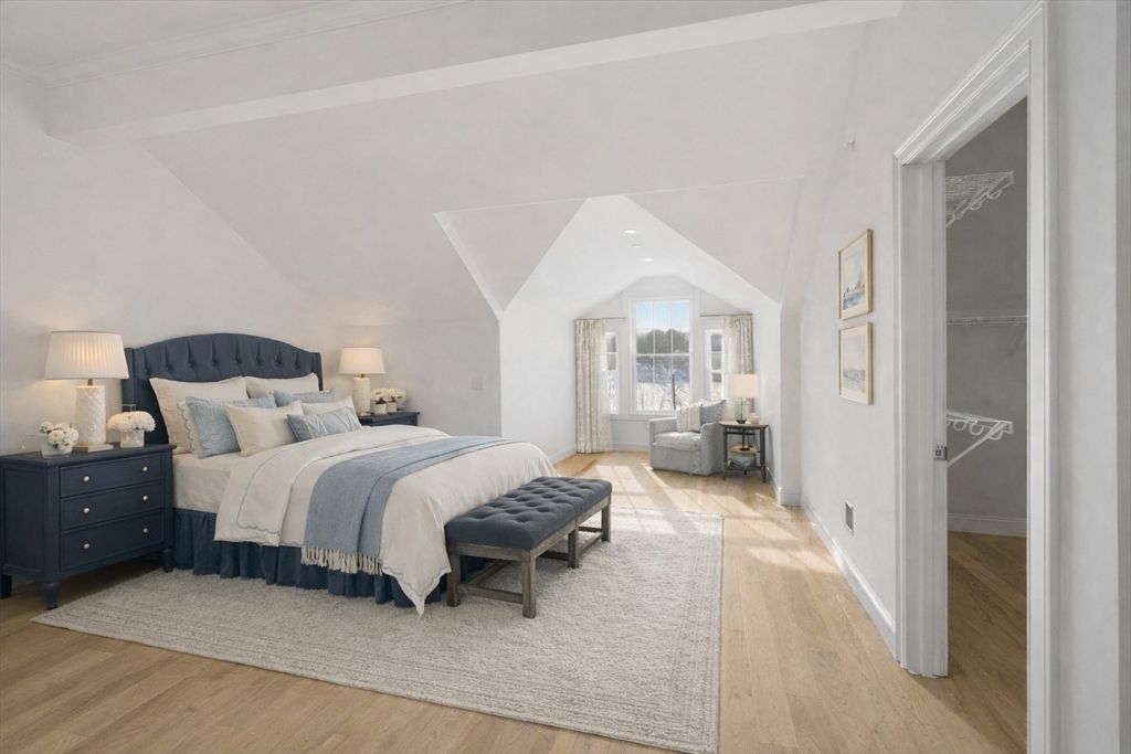 Step into this stunning residence w/ oversize window and soaring ceilings with shimmering water views! The expansive, open-concept layout on main flr features a chef's kit w/ large center island, beautiful cabinetry, & vented cooktop. Kitchen is open to the DR for festive gatherings, & to the gorgeous LR w/ chair rail, crown moldings, and fireplace. A wall of windows & french sliders w/ southern exposure invites you to the balcony overlooking the manicured lawns & serene water vistas. Recessed dimmable LED lighting throughout, grand staircase & an option for an elevator are a few of the many features you'll appreciate. The primary ensuite has elegant crown moldings, space for a sitting area & beautiful views of the pond. 3 guest rooms on 2nd flr! The open, finished lower level with walkout slider to a covered patio leads to the flat backyard overlooking the pond w/ adjacent boat launch. Energy-efficient, zero emissions building.