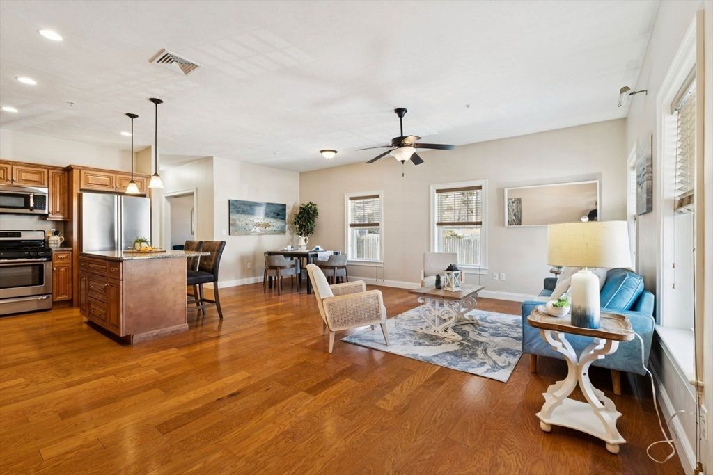 Discover this beautifully designed condo just steps from the Ipswich River and minutes from downtown. This one-bedroom unit with a dedicated office offers a versatile open-concept layout, perfect for modern living. The kitchen features granite countertops, stainless steel appliances, ample cabinetry, and a center island that flows effortlessly into the dining and living areas. Large windows and high ceilings create an airy, light-filled atmosphere that feels both warm and welcoming.The spacious bedroom offers generous walk-in closet space, while the additional office provides the flexibility to work from home or create a cozy guest space. Additional highlights include in-unit laundry, central air, and stylish finishes throughout. Enjoy low-maintenance living in a prime location close to shops, restaurants, commuter rail, and Ipswich's scenic beaches.