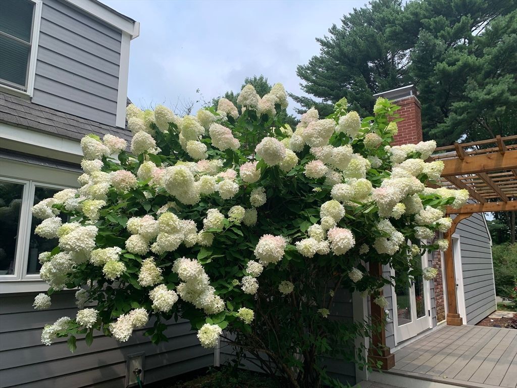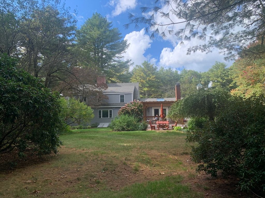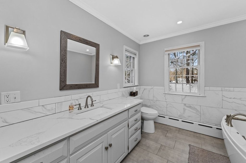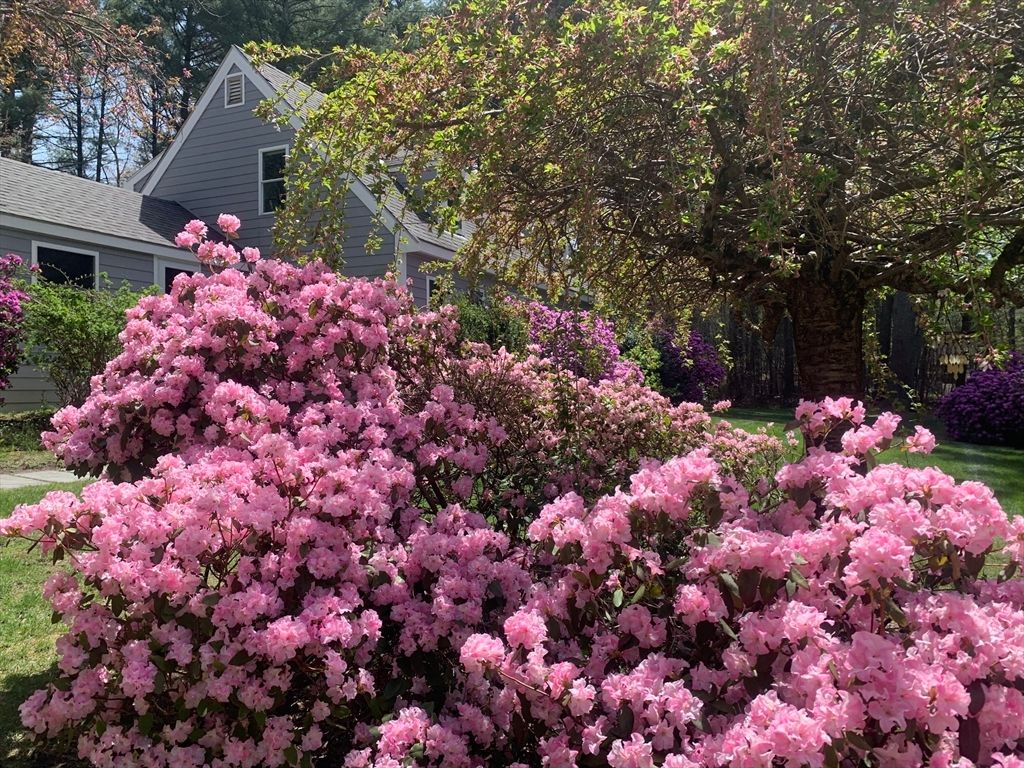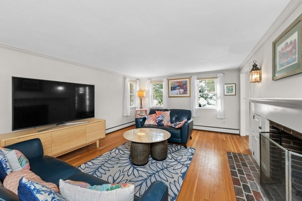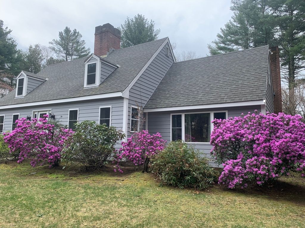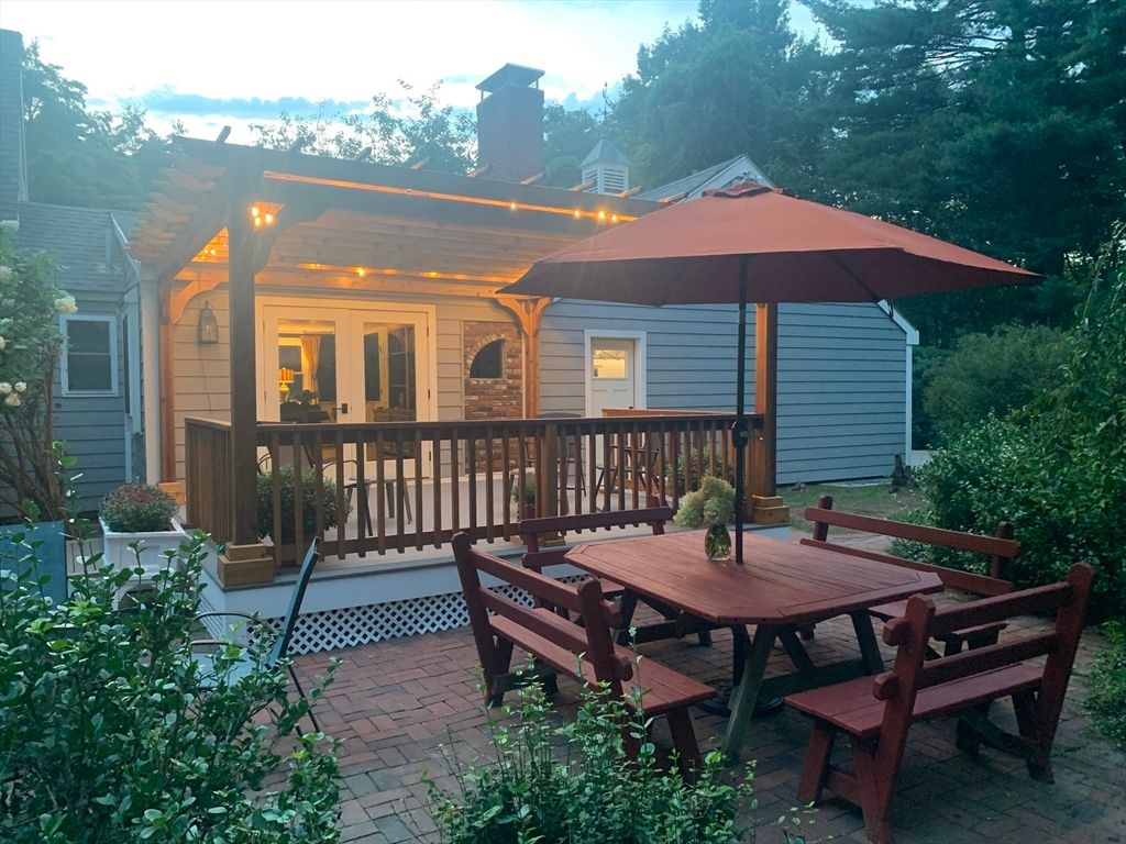 Expanded Cape offering first- and second-floor primary suites w/ stunning gardens, at the end of a quiet dead-end street. Enter through the newly built 2-car garage into a spacious mudroom. The first floor features a flexible layout with 1/2 bath & large dining room, accented by wainscoting, crown molding, built-ins, a skylight, and French doors opening to a new deck with cedar pergola. The bright eat-in kitchen includes granite counters, stainless appliances, and a generous pantry. The oversized living room centers around a wood-burning fireplace, while the first-floor suite provides a private retreat with a wood stove, walk-in closet, in-suite laundry, and a renovated marble bath with steam shower & soaking tub. Upstairs offers another bedroom with en-suite bath & a walk-through fifth bedroom or office, plus 2 additional bedrooms & full bath. The high-ceiling basement adds potential for more living space. Recent updates include the roof, Everlast siding, heating system, and windows.