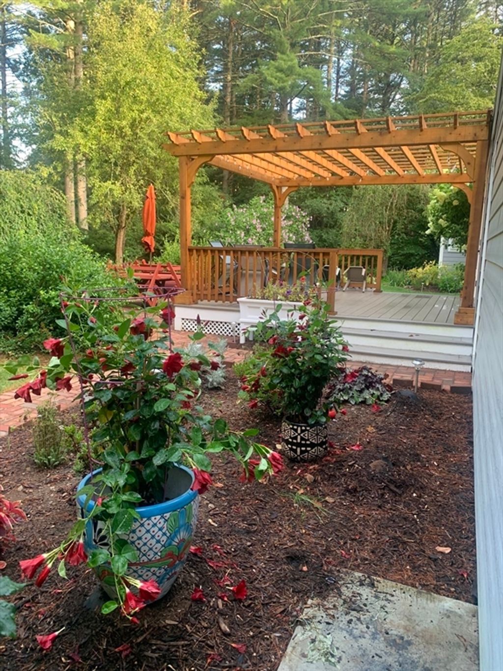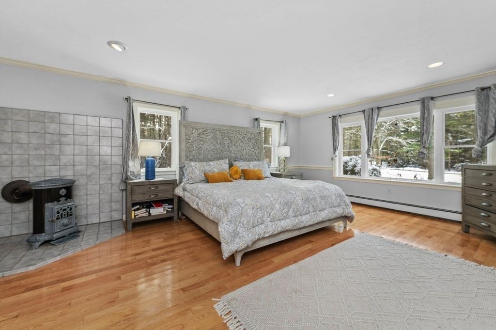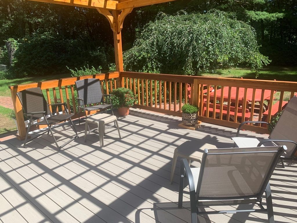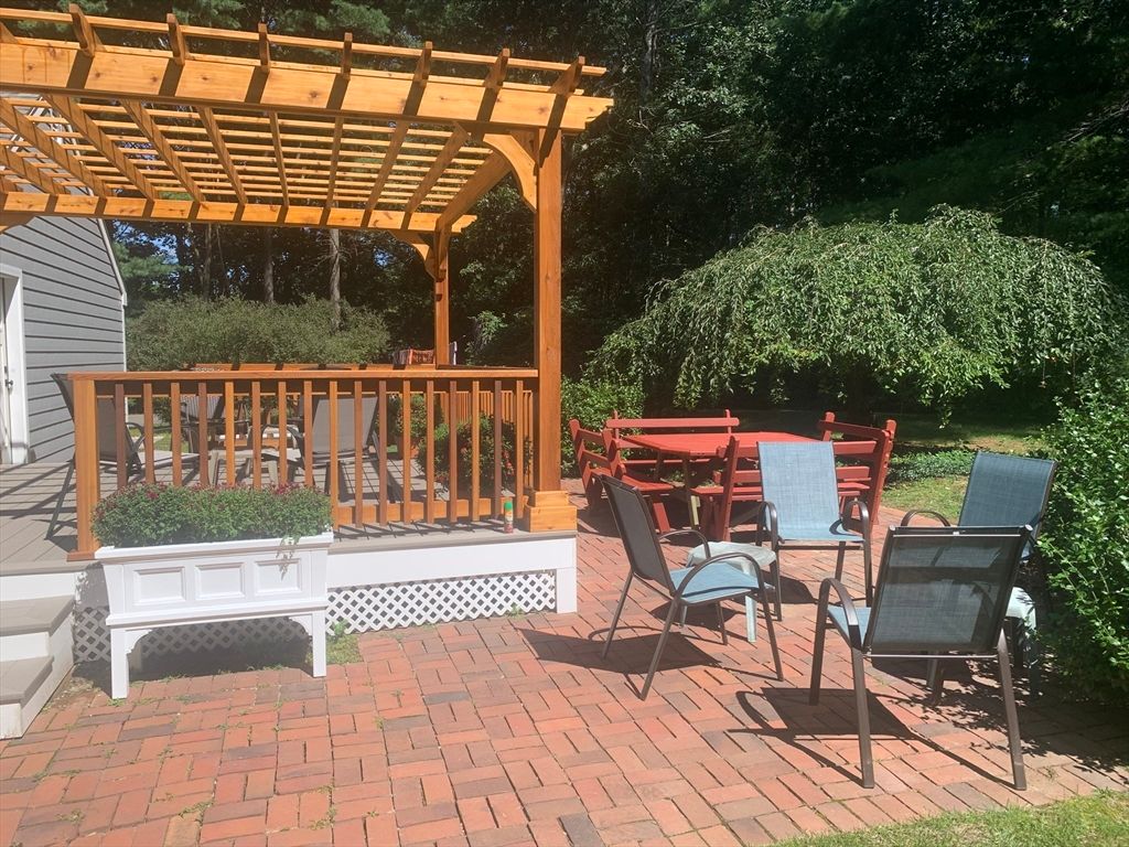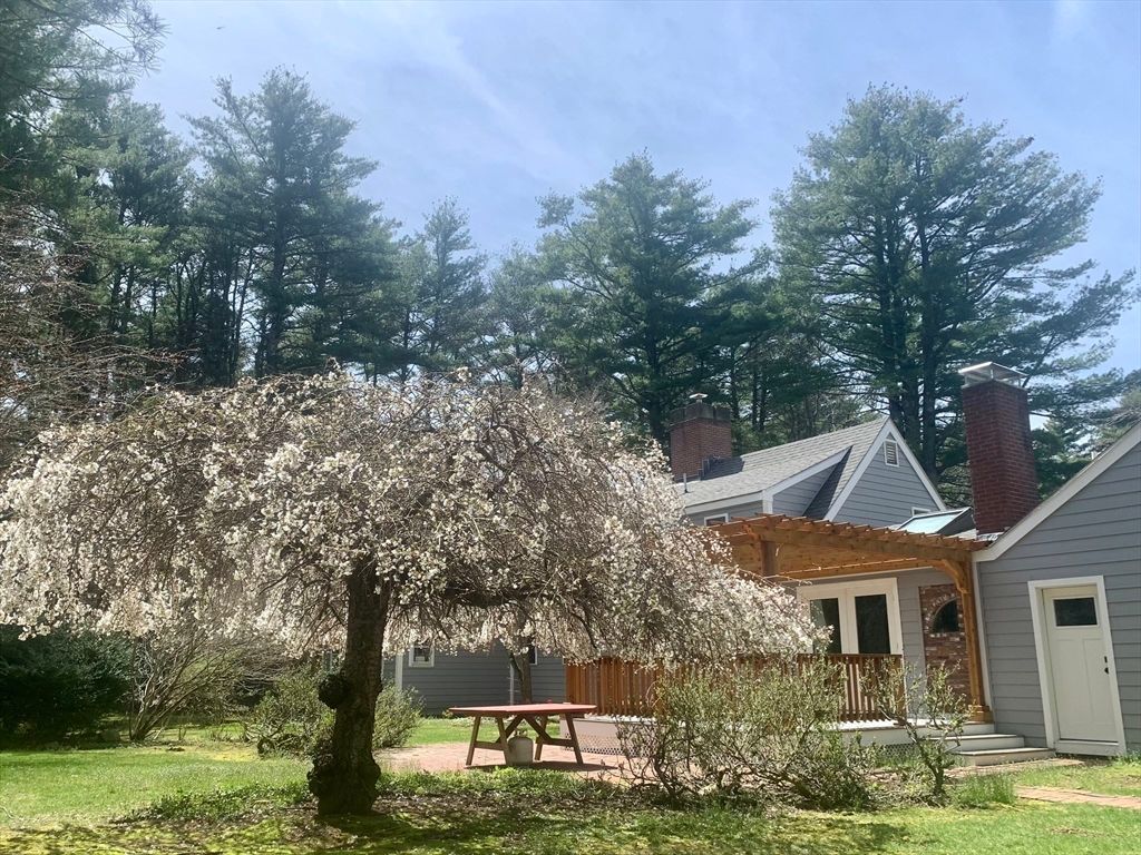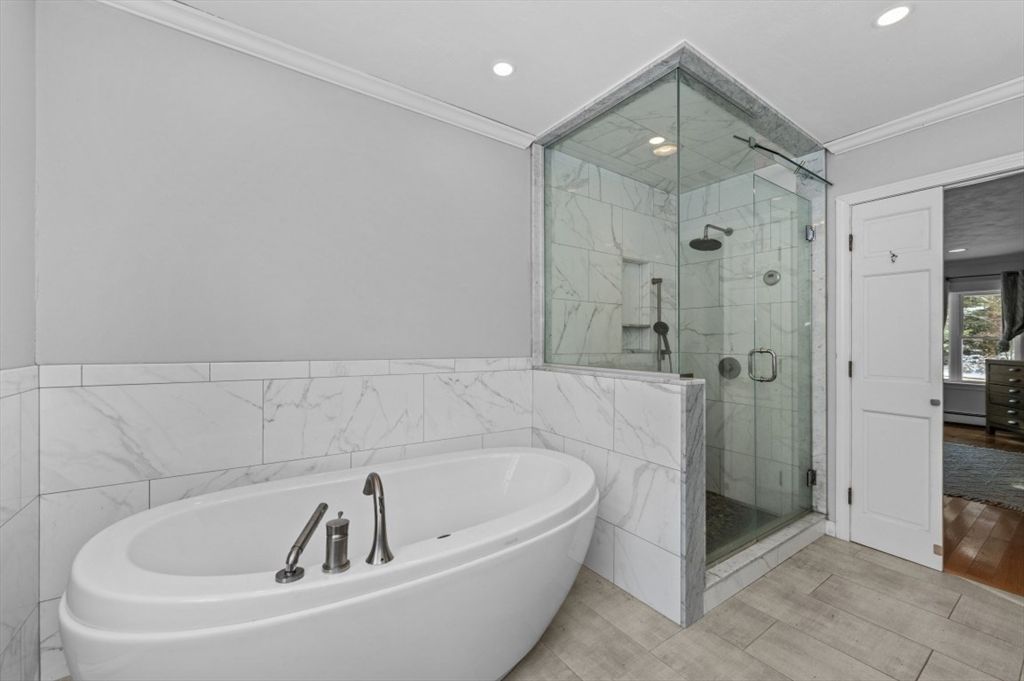 Expanded Cape offering first- and second-floor primary suites w/ stunning gardens, at the end of a quiet dead-end street. Enter through the newly built 2-car garage into a spacious mudroom. The first floor features a flexible layout with 1/2 bath & large dining room, accented by wainscoting, crown molding, built-ins, a skylight, and French doors opening to a new deck with cedar pergola. The bright eat-in kitchen includes granite counters, stainless appliances, and a generous pantry. The oversized living room centers around a wood-burning fireplace, while the first-floor suite provides a private retreat with a wood stove, walk-in closet, in-suite laundry, and a renovated marble bath with steam shower & soaking tub. Upstairs offers another bedroom with en-suite bath & a walk-through fifth bedroom or office, plus 2 additional bedrooms & full bath. The high-ceiling basement adds potential for more living space. Recent updates include the roof, Everlast siding, heating system, and windows.