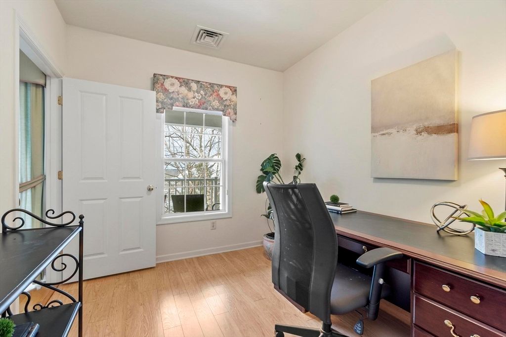 A beautifully maintained garden-style condo built by PULTE and located in COACHMAN'S RIDGE. This spacious 2 bedroom and 1 bath unit also features a versatile home office/den, perfect for remote work or additional guest space. The large OPEN CONCEPT living and dining area flow seamlessly out to a private balcony, ideal for relaxing with your morning coffee. Enjoy the convenience of an EAT-IN kitchen and generous closet space. This move-in ready TOP FLOOR unit offers 9' CEILINGS, plenty of natural light, neutral colors and single level living. Additional highlights include assigned GARAGE PARKING, EXTRA STORAGE, ELEVATOR, IN-UNIT LAUNDRY and new HVAC. A well-maintained community with professional landscaping, easy highway access, and just minutes from downtown. Get ready for maintenance-free living while enjoying everything Andover has to offer, including the nearby YMCA, shopping, dining, commuter routes, and more!