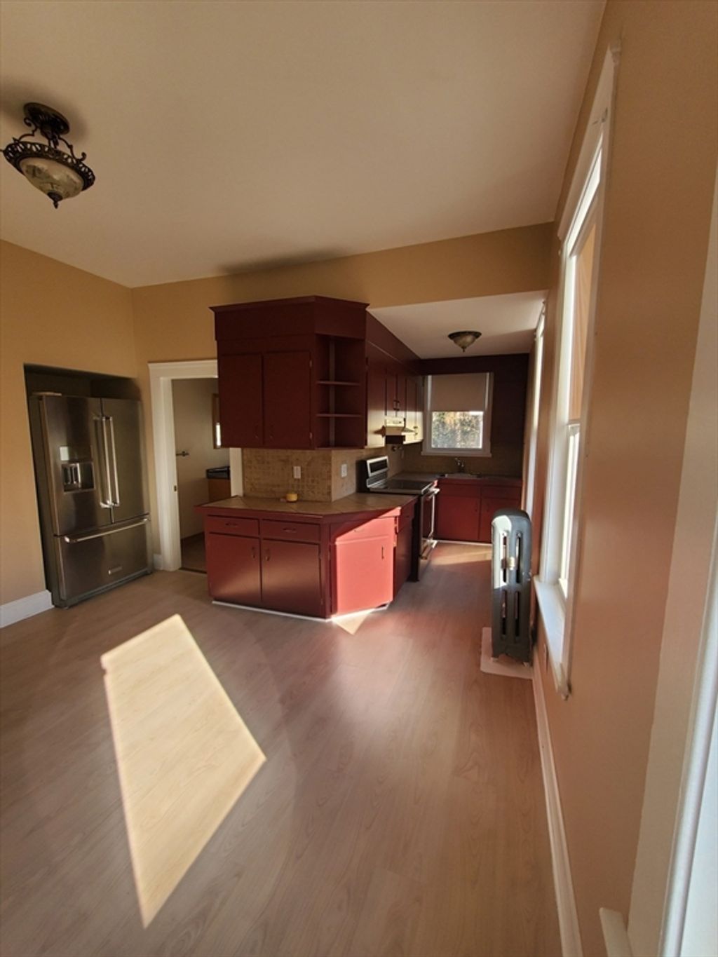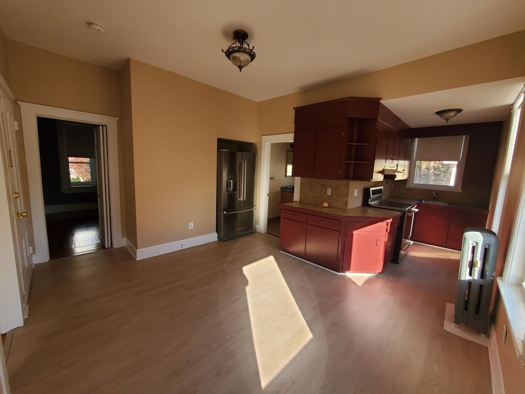 Bright, and airy four room / one bedroom apartment located on the first floor of a lovely owner occupied colonial 3 family house on Lowell Street Peabody. Hardwood floors. Large updated bathroom, large eat in kitchen with new luxury vinyl plank flooring, and KitchenAid electric range and KitchenAid French door refrigerator with bottom freezer. Beautiful large master bedroom with huge walk-in closet and chandelier. Nice dining room with additional built-ins, living room with beautiful decorative fireplace. Dedicated storage and washer dryer hookup provided for you in the basement. Off street parking for up to two cars. Oil heat but new heating system is extremely efficient. First, last, $1000 security.