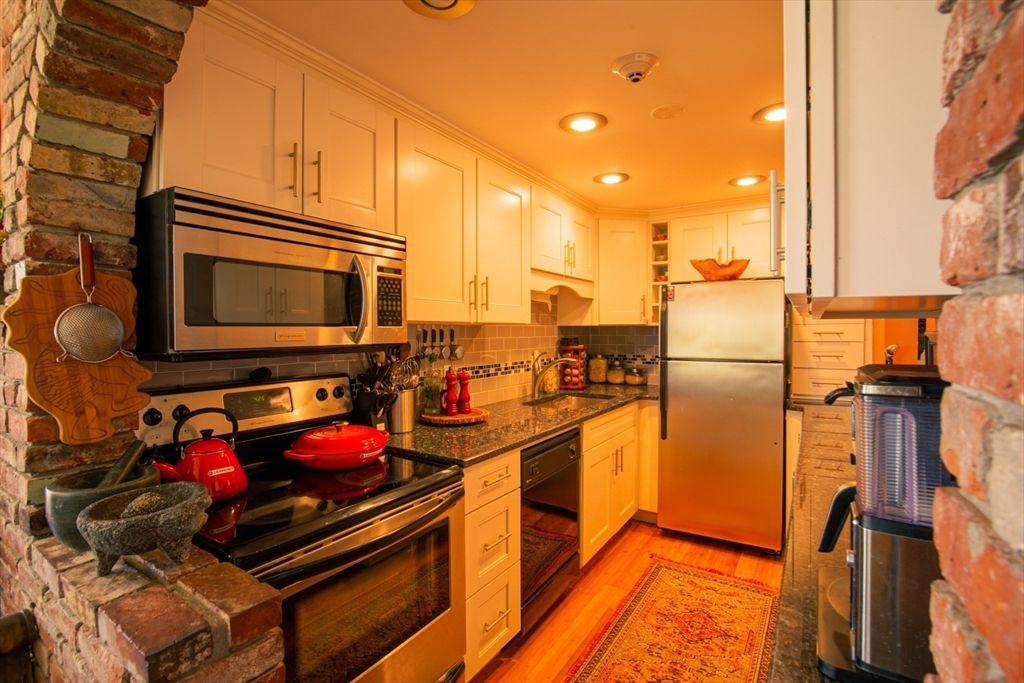 Perched atop a hill at The Colonnade, this historic end-unit offers unmatched privacy and peace. This expansive 2bed/2bath unit features a grand private entrance with a spacious entryway, leading up to the family room rich with period wainscoting, built-ins, and a wood-burning fireplace. The sun-drenched, south-facing dining room opens to a private covered patio, perfect for morning coffee or evening sunsets. The main floor also offers a galley kitchen with granite countertops and shaker cabinets, and a primary suite with a walk-in closet and en-suite bath. Washer & Dryer are common use and located in the building. Downstairs, discover a second bedroom, a newly renovated full bath, and a massive walk-in closet that doubles as an office or gym. Complete with a private garage and extra storage, this home is ideally located near Brooks School, I-495, and scenic conservation land, offering the perfect blend of accessibility and peace. Available 4/1 or sooner. Unit to be freshly painted.