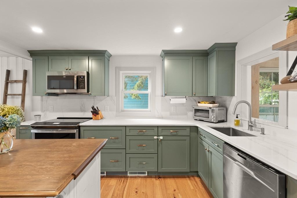 Warm and inviting cape in an outstanding neighborhood checks many boxes and shows beautifully. Perfectly updated kitchen features SS appliances (GE induction stove w/air fryer feature) quartz countertops, nice cabinets and warm new wood flooring throughout open concept main living area.Natural light floods into FP living room from large bay window and is nicely accented with newly installed recessed lighting. Bonus family room off kitchen has vaulted ceiling and walls of windows framing beautiful fenced in yard.Smart floor plan offers up use options depending on your needs...first floor office and bedroom or two first floor bedrooms if needed. Main level refreshed full bath sets up nicely for single level living. Upstairs you will find 2 very generously sized bedrooms with good closet space and 1/2 bath which could easily be converted to 3/4.Basement w/great storage with potential for growth,1 car attached garage. Premier location and neighborhood.