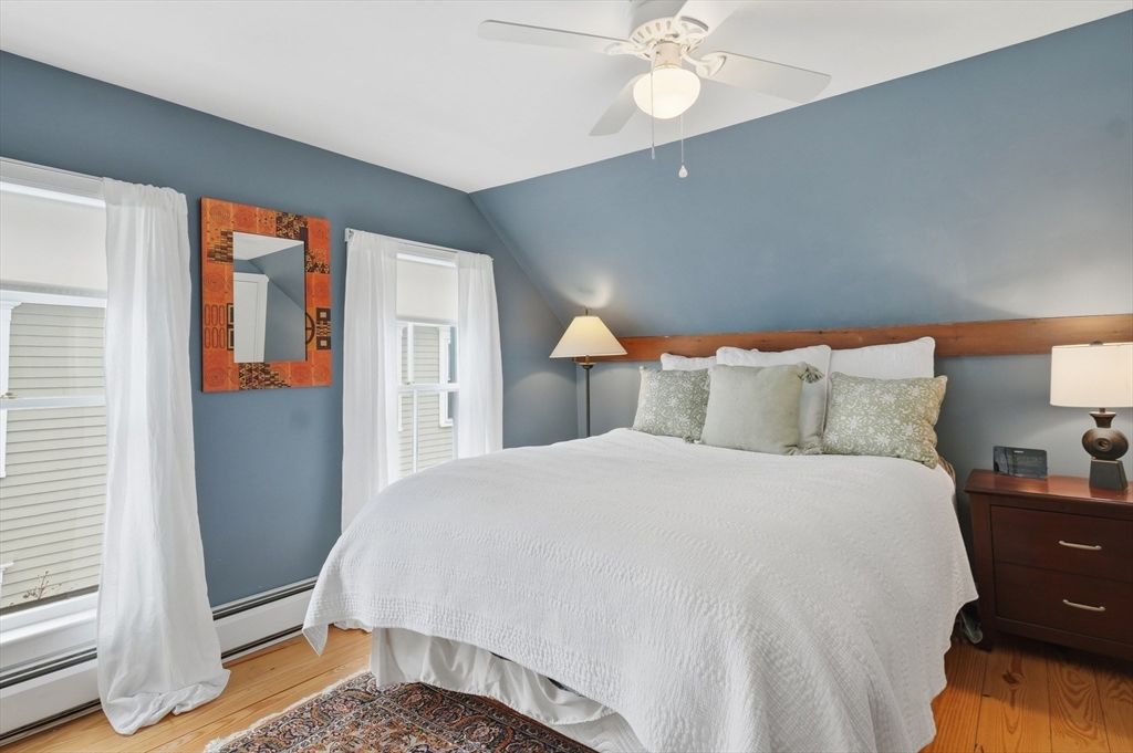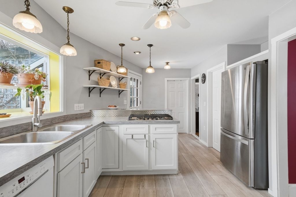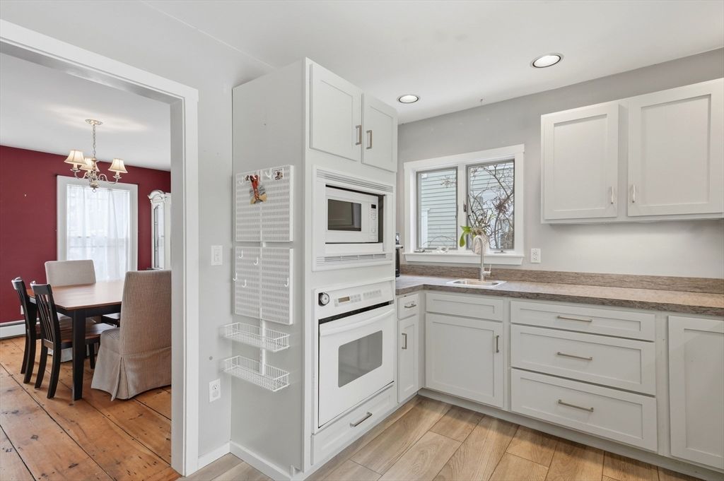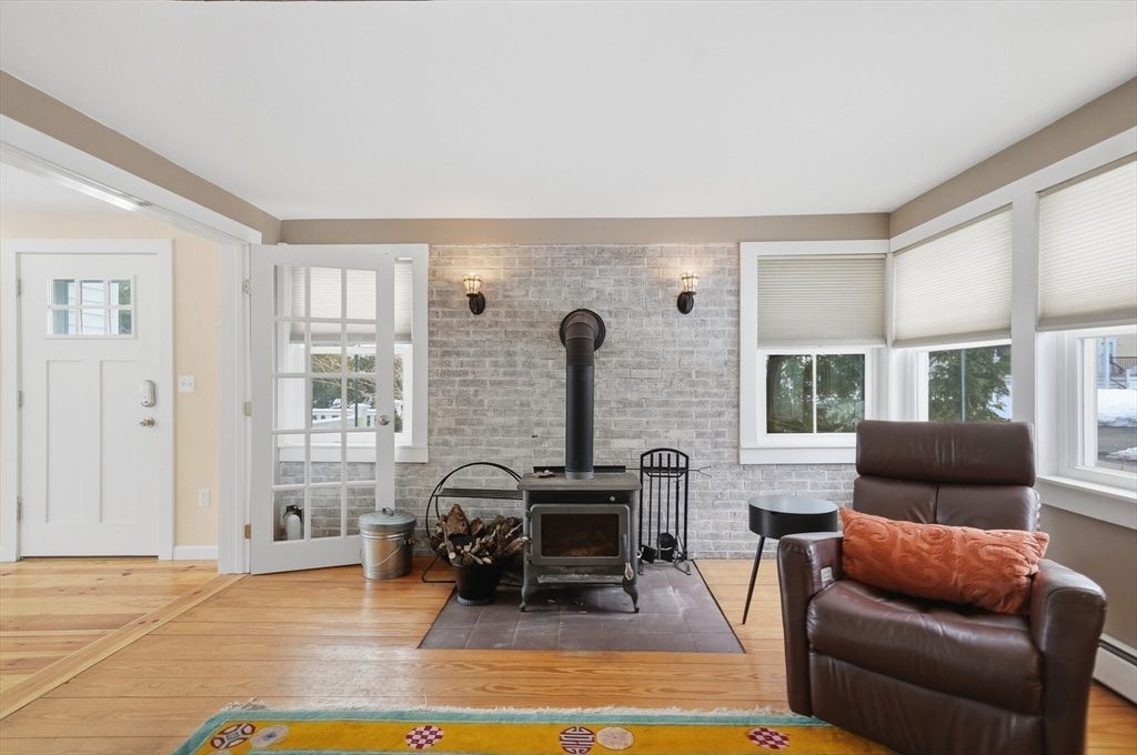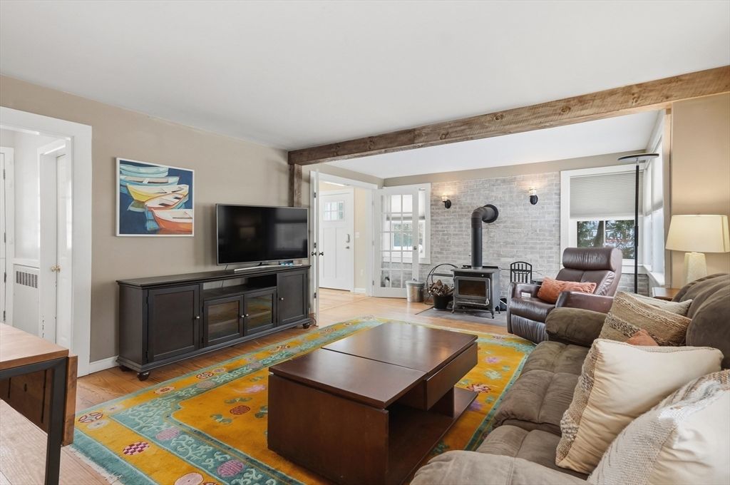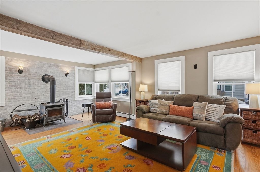 Just moments from downtown and the public beach at Lake Gardner, this charming 3 bedroom home offers a comfortable layout with inviting spaces throughout. A light filled sunroom added in 2022 truly lives up to its name, surrounded by windows and skylights and perfect for morning coffee or a quiet place to unwind. The spacious family room features exposed brick and a cozy woodstove, creating a welcoming gathering space. The kitchen includes upgraded cabinetry, open shelving, a breakfast bar, and a second sink ideal for a wet bar or entertaining. A dining room with a built in hutch adds timeless charm. The first floor also offers a half bath with laundry. Upstairs are three bedrooms and a full bath. Outside, enjoy a flat yard fenced on three sides with a deck and patio, plus lush garden plantings designed by a landscape architect. A pergola draped in wisteria vines creates a beautiful place to relax or entertain. Close to Amesbury's trendy boutiques, artist studios, and breweries.
